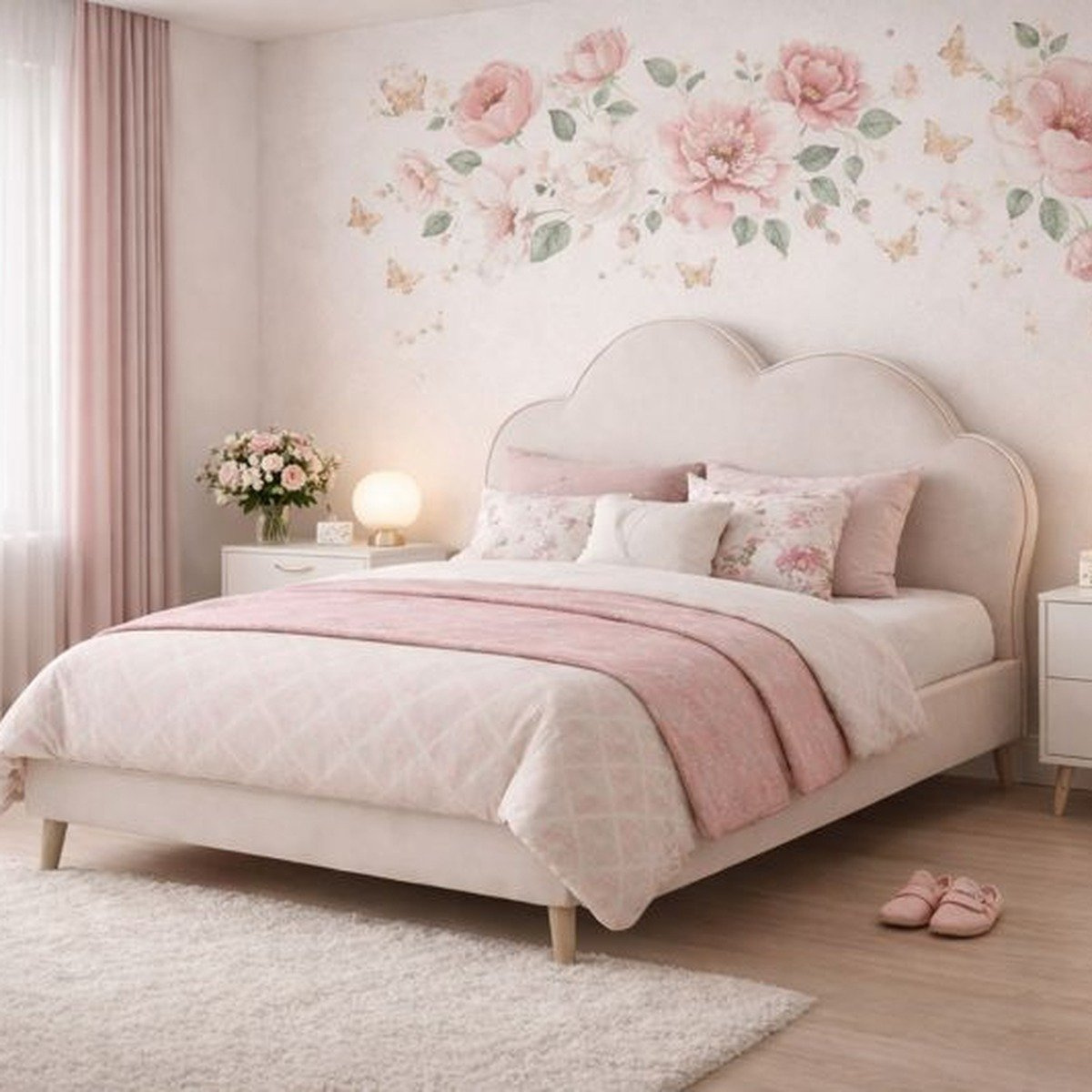 Upholstered Bed Frame with Cloud-Style Headboard & Wooden Legs