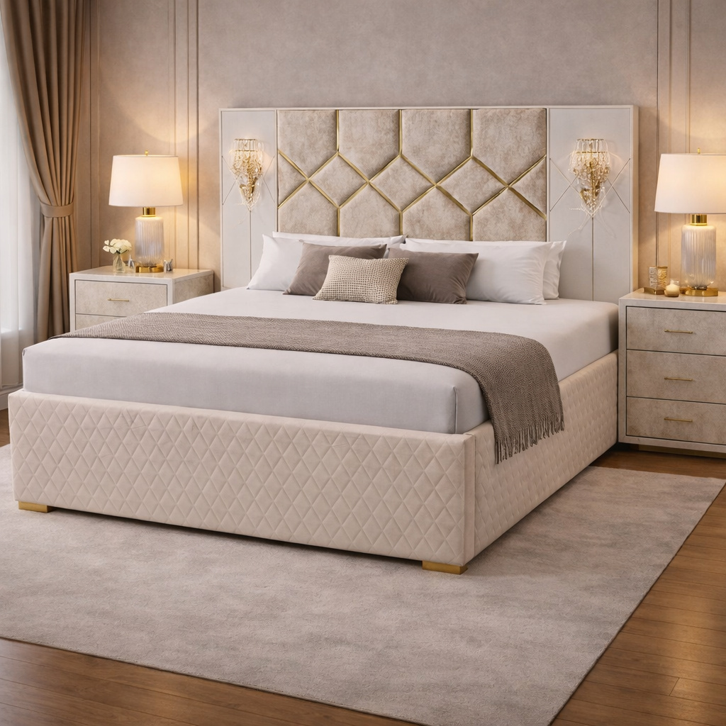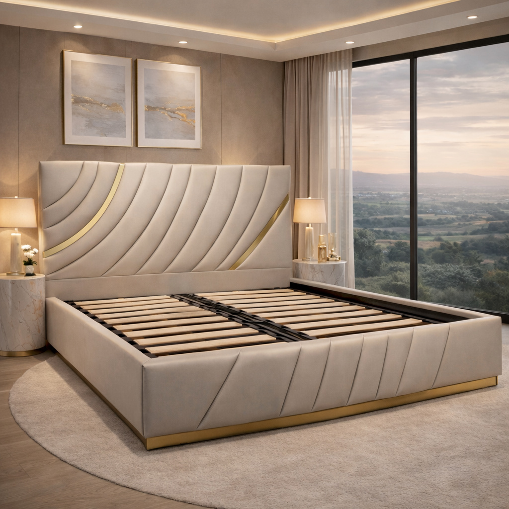 Designer Upholstered Bed Frame with Abstract Panel Headboard & Gold Inlay Accents
