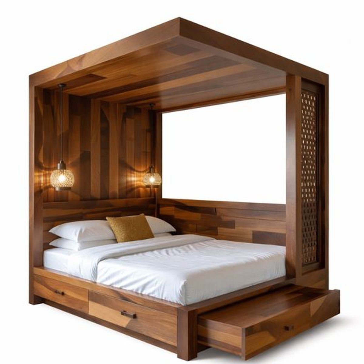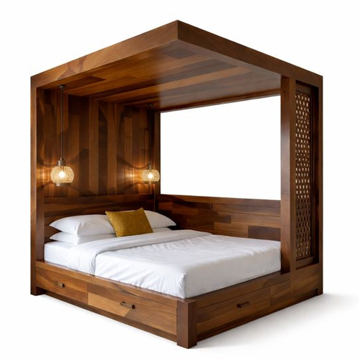 - Bed Design: Modern four-poster canopy frame with solid overhead structure