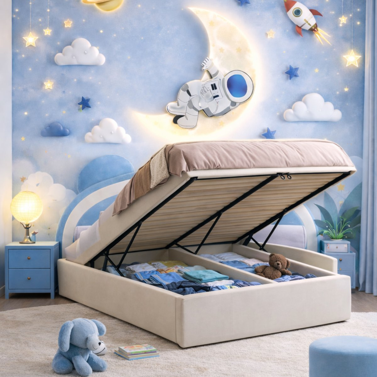 Built with a robust internal structure, the bed offers excellent durability and long-term support. The lift-up storage mechanism provides generous hidden space beneath the bed, making it easy to organize bedding, toys, clothes, and everyday essentials—keeping the room neat and clutter-free.