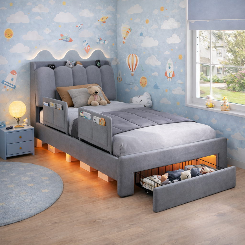 Built with a sturdy internal structure, the bed offers excellent stability while maximizing everyday practicality. The upholstered frame ensures a soft, child-friendly finish, while the smart storage solution helps keep the room organized without compromising on style.