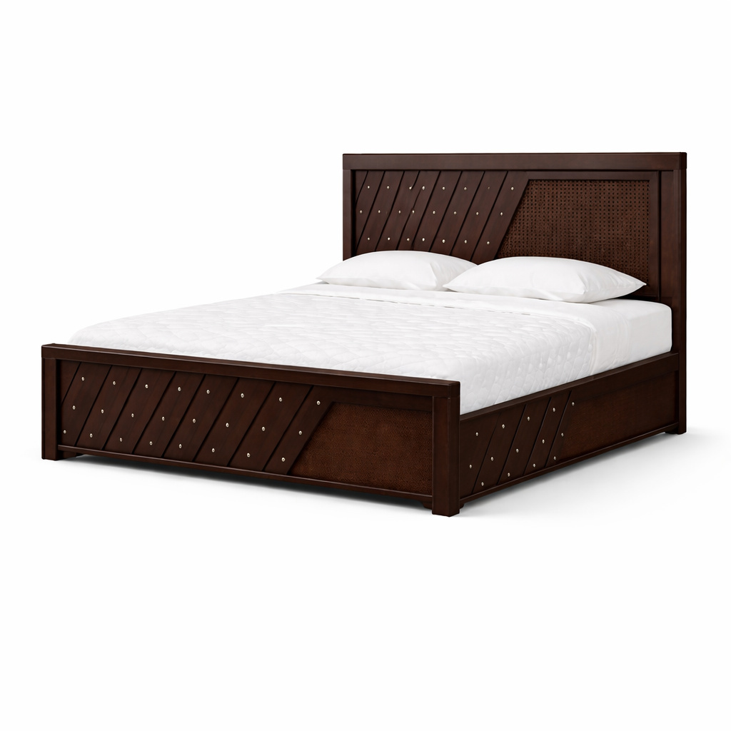 - Bed Design: Diagonal panel detailing with stud accents on headboard and footboard