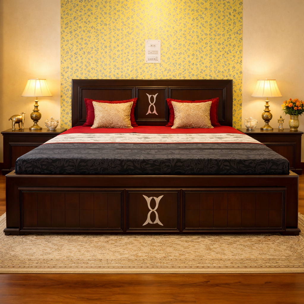 - Bed Design: Panel-style headboard and footboard with central decorative inlay motif