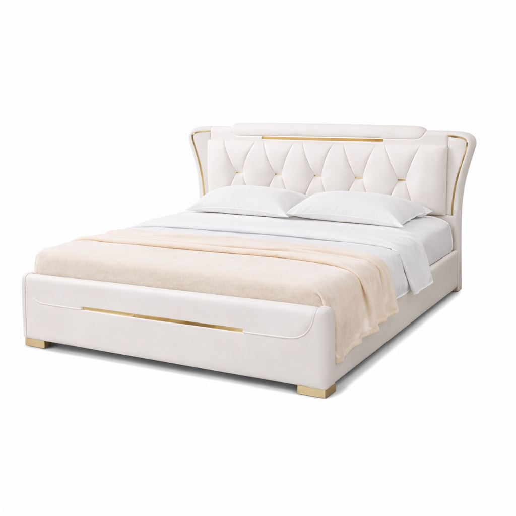 Crafted with a strong wooden structure, this bed offers dependable support and long-term durability. The smooth upholstered finish paired with minimal metallic highlights creates a sophisticated balance of comfort and style, making it an ideal choice for upscale bedrooms that value understated elegance and modern design.