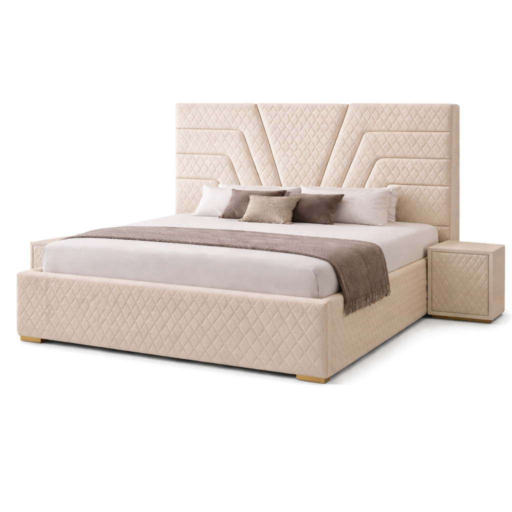 - Bed Design: Upholstered bed with quilted geometric-panel headboard