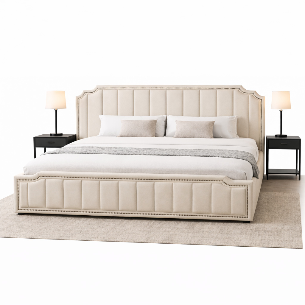 Premium Upholstered Bed Frame with Vertical Channel Headboard & Nailhead Trim