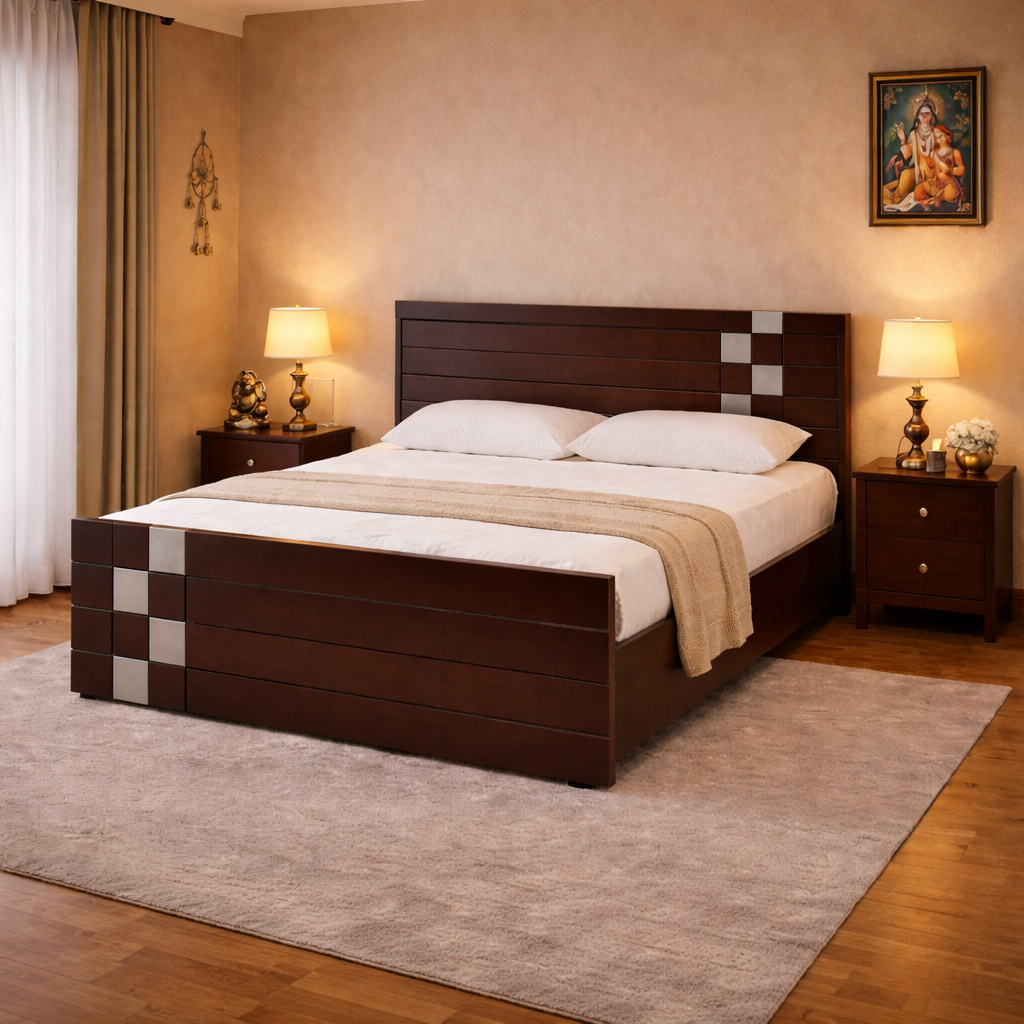 Contemporary Solid Wood Bed Frame with Horizontal Slats & Contrast Inlay