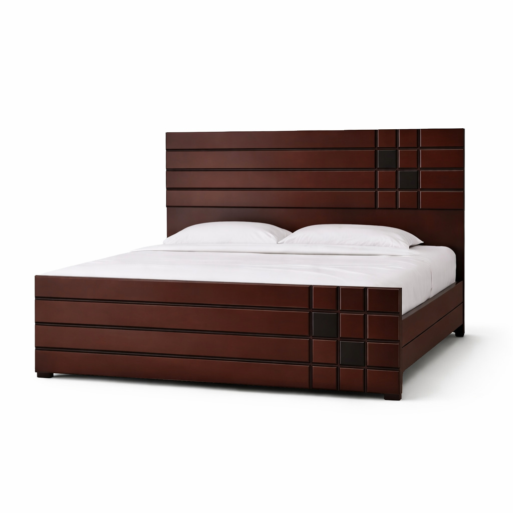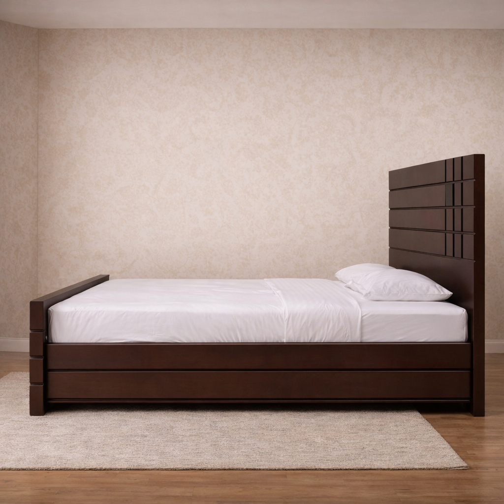 ₹37699 40% OFFDesigned with a bold, contemporary aesthetic, this wooden bed features clean horizontal panel detailing that adds depth and structure to the overall form. The rich wooden finish and balanced proportions make it a perfect fit for modern, urban, and refined bedroom interiors. Its minimalist yet solid presence creates a sophisticated sleeping space with timeless appeal.