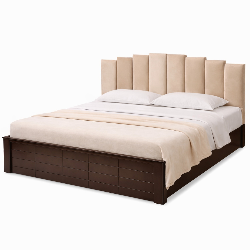 Crafted for everyday comfort and durability, the sturdy wooden structure provides reliable support and long-lasting stability. The neutral upholstered headboard pairs beautifully with the rich wood finish, making it easy to coordinate with bedside tables, wardrobes, and a wide range of décor styles.