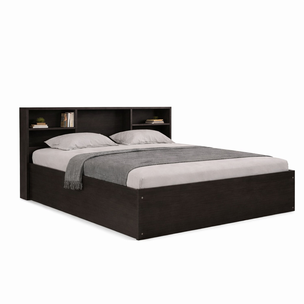 ₹26999 40% OFFThis modern wooden bed showcases a clean, minimalist silhouette enhanced by a functional bookshelf-style headboard. The integrated open shelves provide convenient space for books, décor accents, or bedtime essentials, making the design both practical and visually balanced. Its straight-lined frame and dark wood finish create a contemporary look that fits seamlessly into modern, urban, and compact bedroom interiors.
