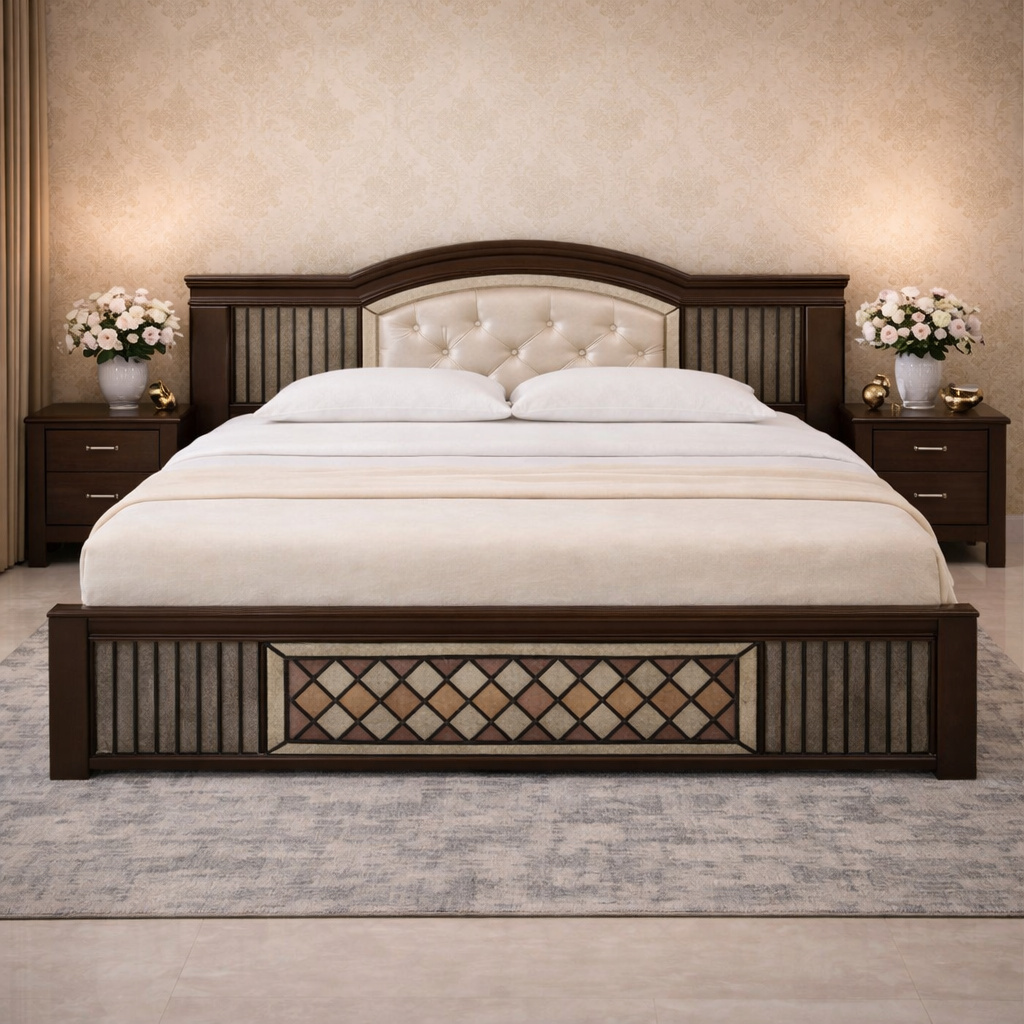 Royal Upholstered Bed Frame with Hand-Carved Wooden Accents & Tufted Panels
