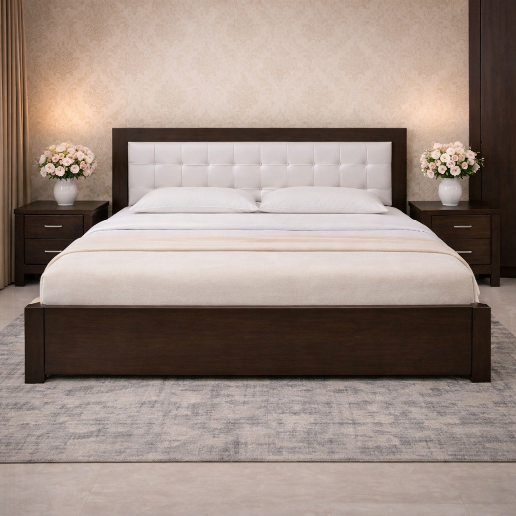 Solid Wood Bed Frame with Upholstered Tufted Headboard & Panelled Base