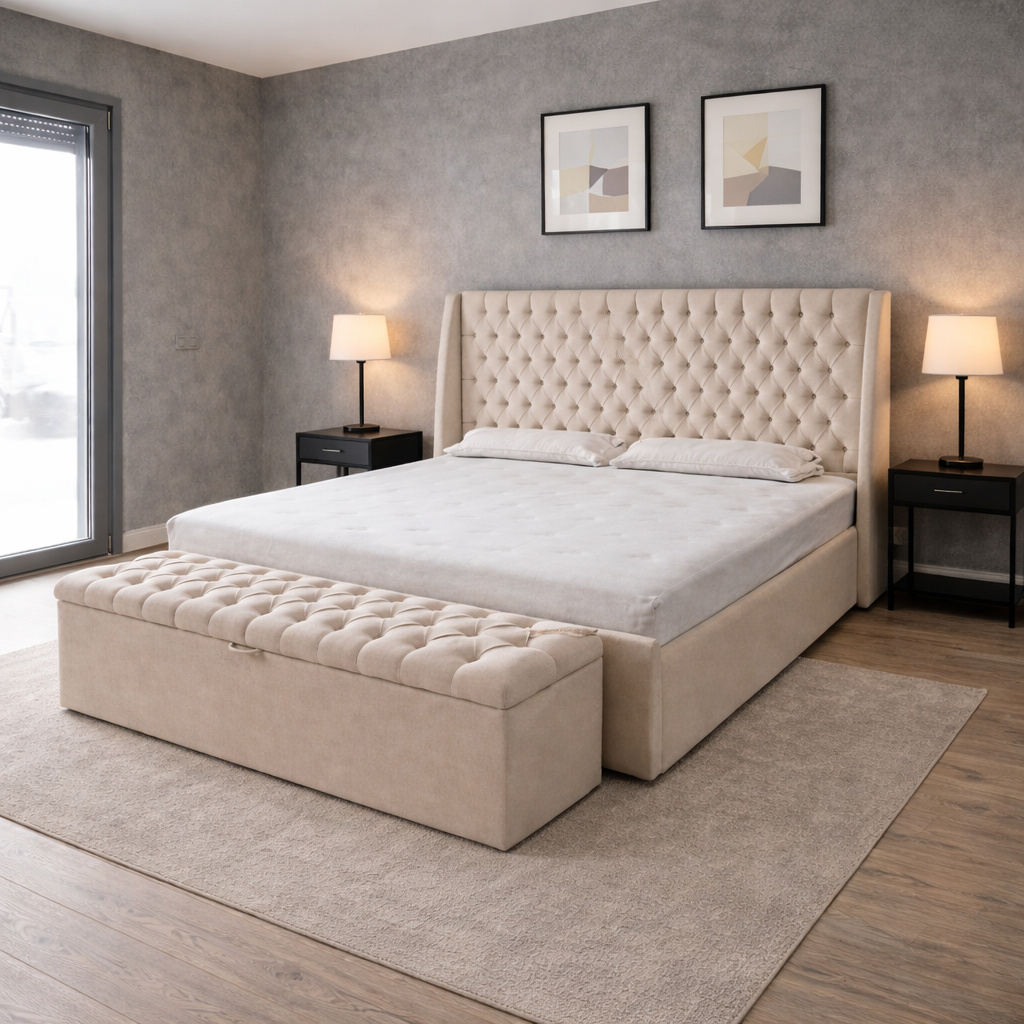 Luxury Upholstered Bed Frame with Deep Tufted Wingback Headboard & Matching Bench