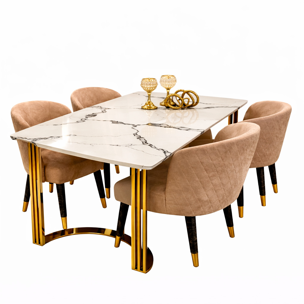 Luxury Marble Top 6-Seater Dining Table Set with Gold Metal Base & Upholstered Chairs