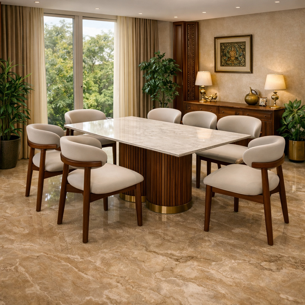 Modern Marble Top 6-Seater Dining Table Set with Solid Wooden Legs & Upholstered Chairs