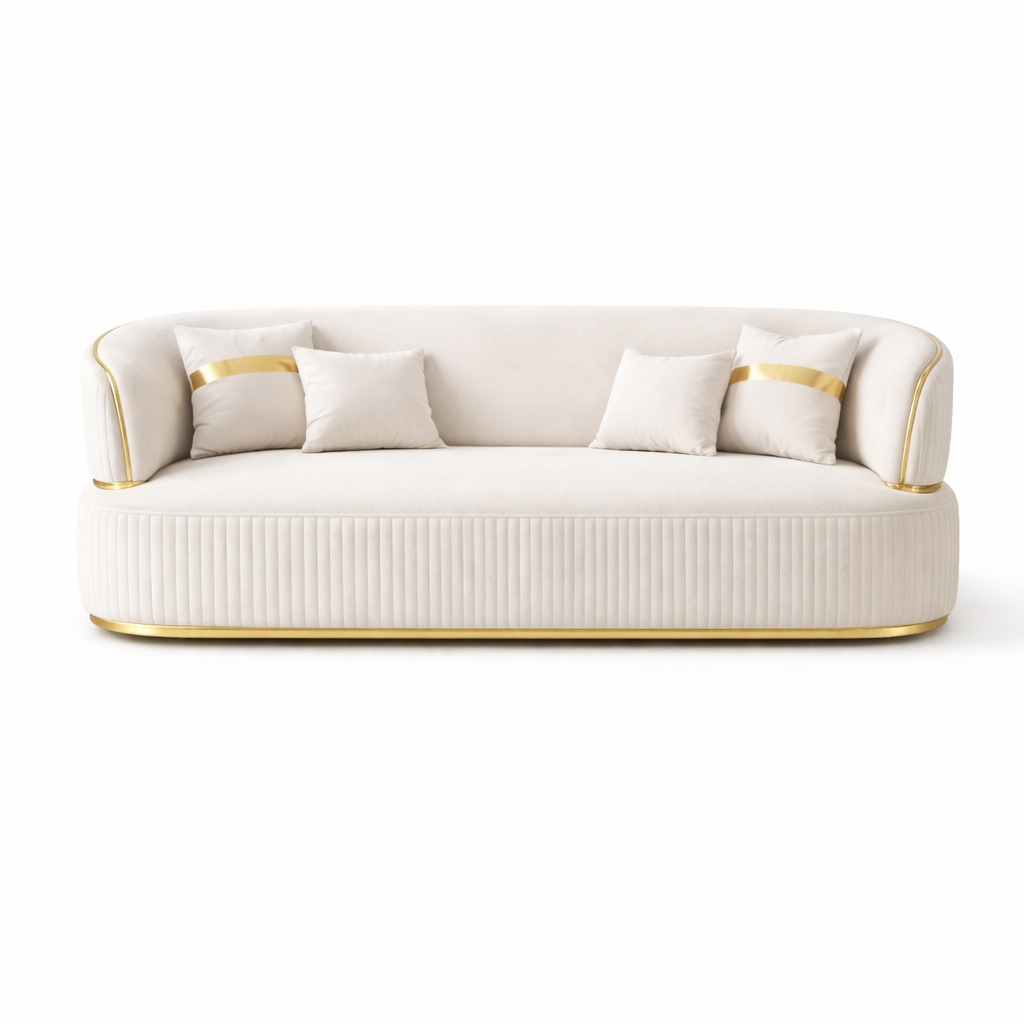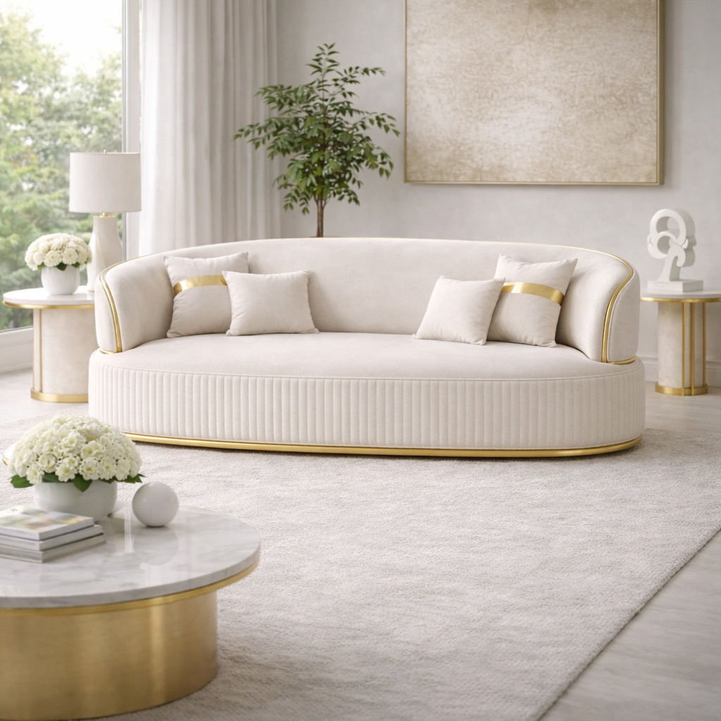 Crafted for both comfort and visual appeal, the sofa offers generously cushioned seating with supportive backrests that encourage relaxed lounging. Its smooth rounded arms, balanced proportions, and low-profile base give it a graceful presence, while the gold-finished accents add a touch of understated glamour, making it perfect for modern luxury, hotel-style, and designer homes.