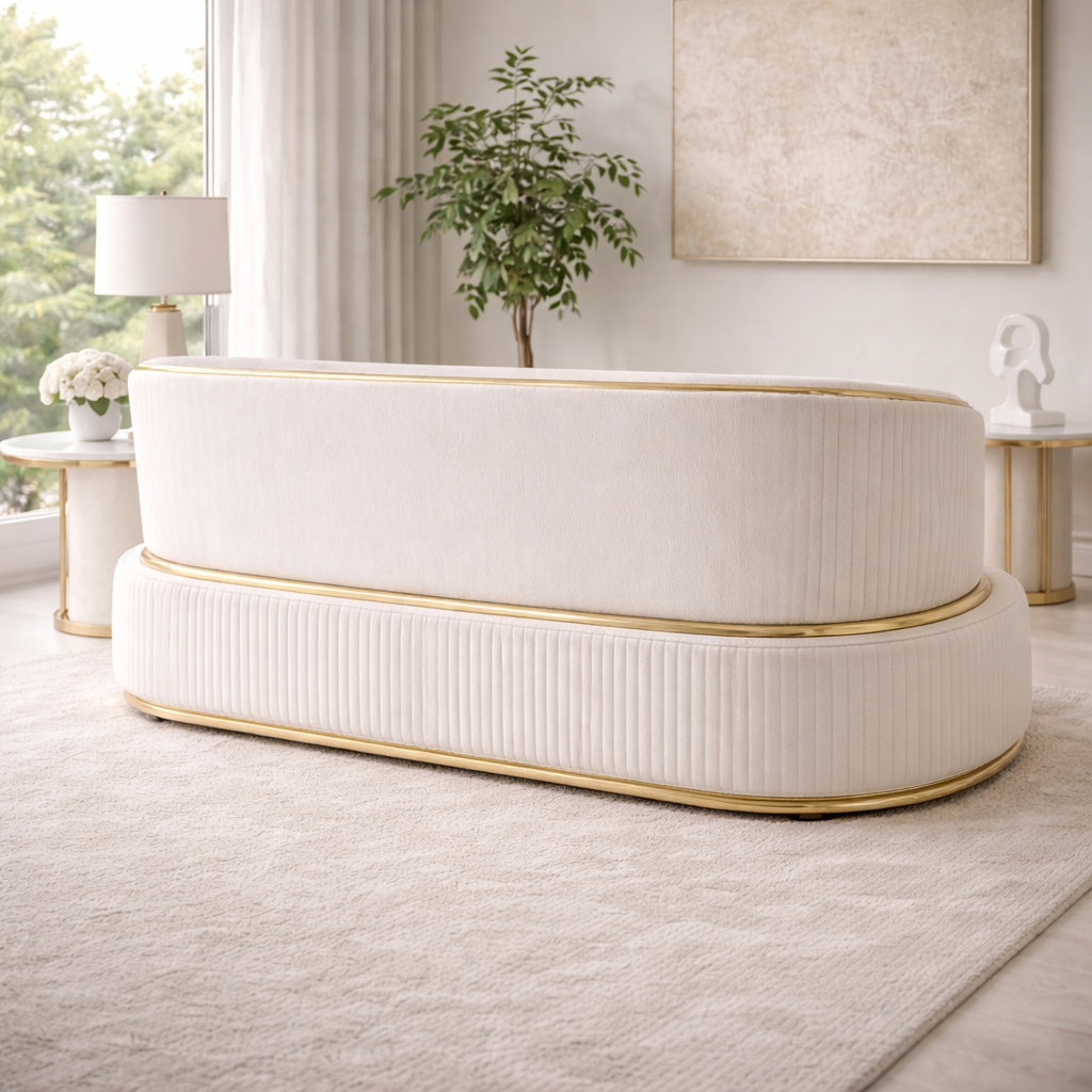 ₹81999 35% OFFDesigned to embody refined modern luxury, this elegant contemporary sofa features a soft curved silhouette with vertically channelled upholstery and subtle gold-accent detailing. The plush, light-toned fabric combined with metallic highlights creates a sophisticated statement piece that elevates premium living rooms, lounges, and high-end interiors.