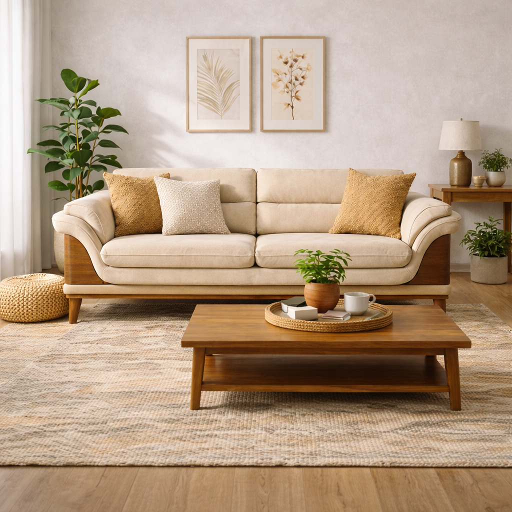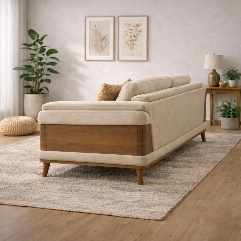 ₹44429 35% OFFDesigned for refined everyday comfort, this elegant three-seater sofa showcases a softly contoured silhouette with gently flared arms and a supportive, well-cushioned seat. The warm neutral upholstery is beautifully complemented by exposed wooden side panels and tapered wooden legs, creating a harmonious blend of modern sophistication and classic warmth.