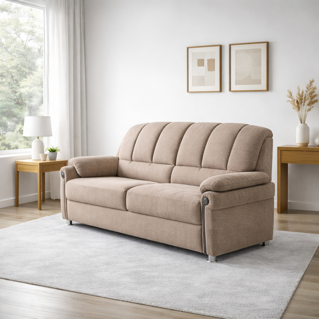 - Sofa Design: Upholstered sofa with cushioned backrest and padded armrests
