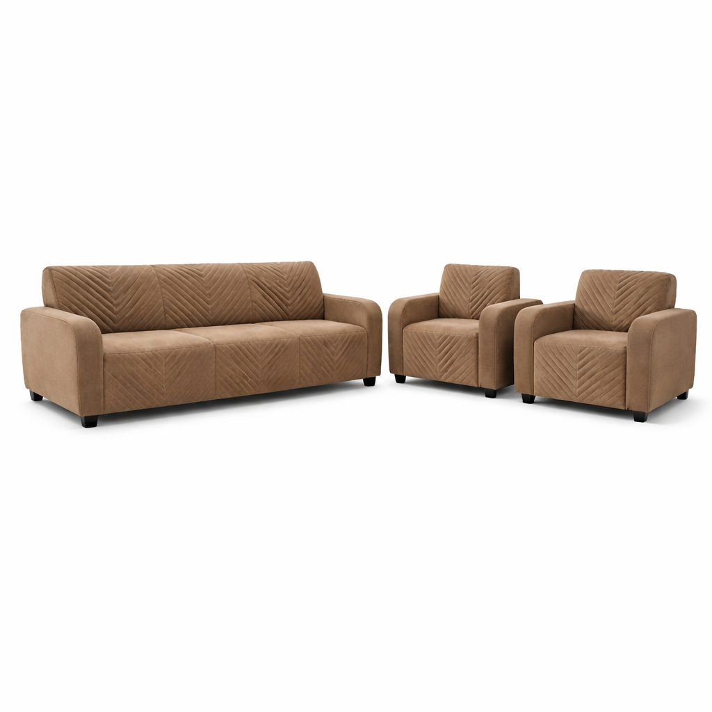 ₹60589 40% OFFDesigned for modern comfort and everyday elegance, this contemporary sofa set features a three-seater paired with two matching single-seater chairs, highlighted by subtle chevron-style channel stitching. The warm neutral upholstery and clean, structured form create a calm and inviting atmosphere, ideal for modern living rooms and family spaces.