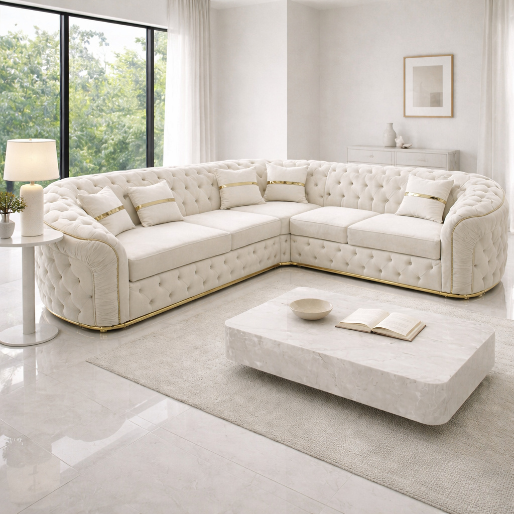 Luxury Curved Tufted L-Shape Sofa with Gold Base